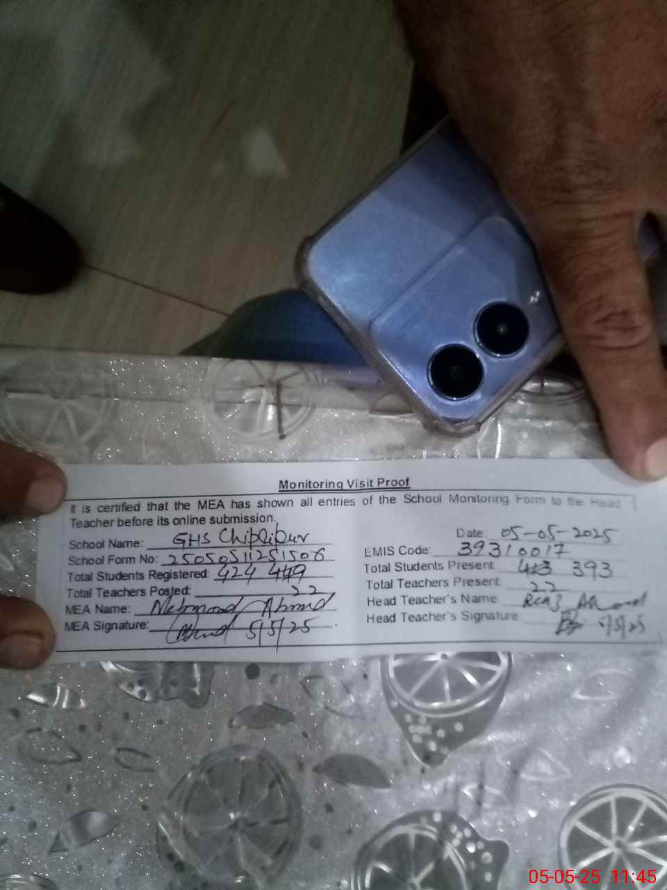 | Attendance Register | Head Teacher | MEA with School | Visit Proof |