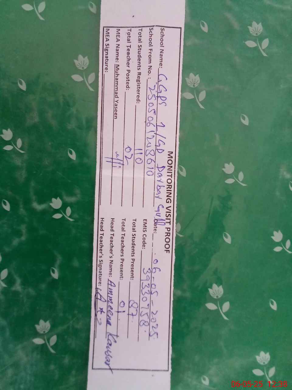 | EMIS Code: 39330758 | Name of School: GGPS CHAK NO.1/GD DARBAR GUL | |||