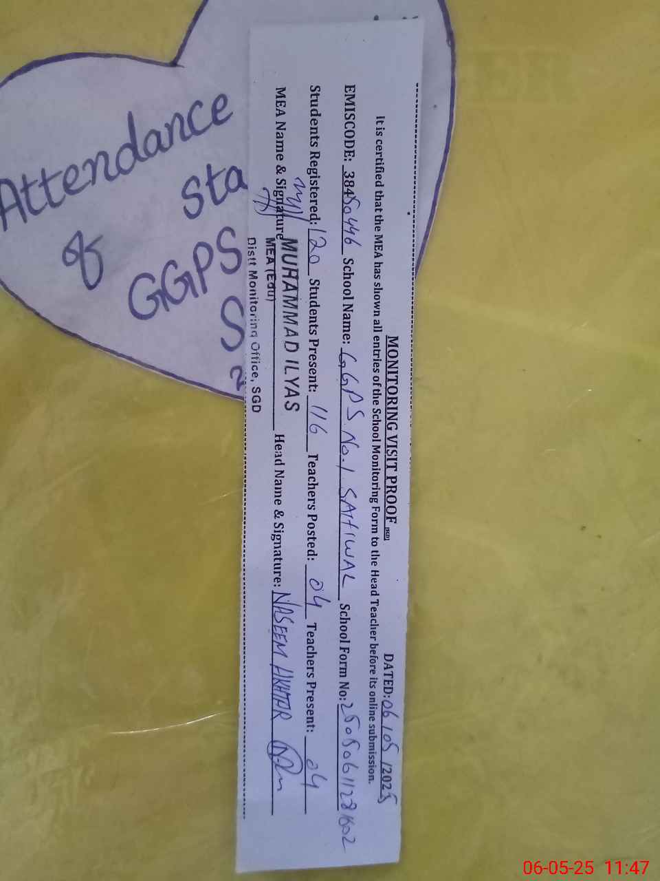 | Attendance Register | Head Teacher | MEA with School | Visit Proof |