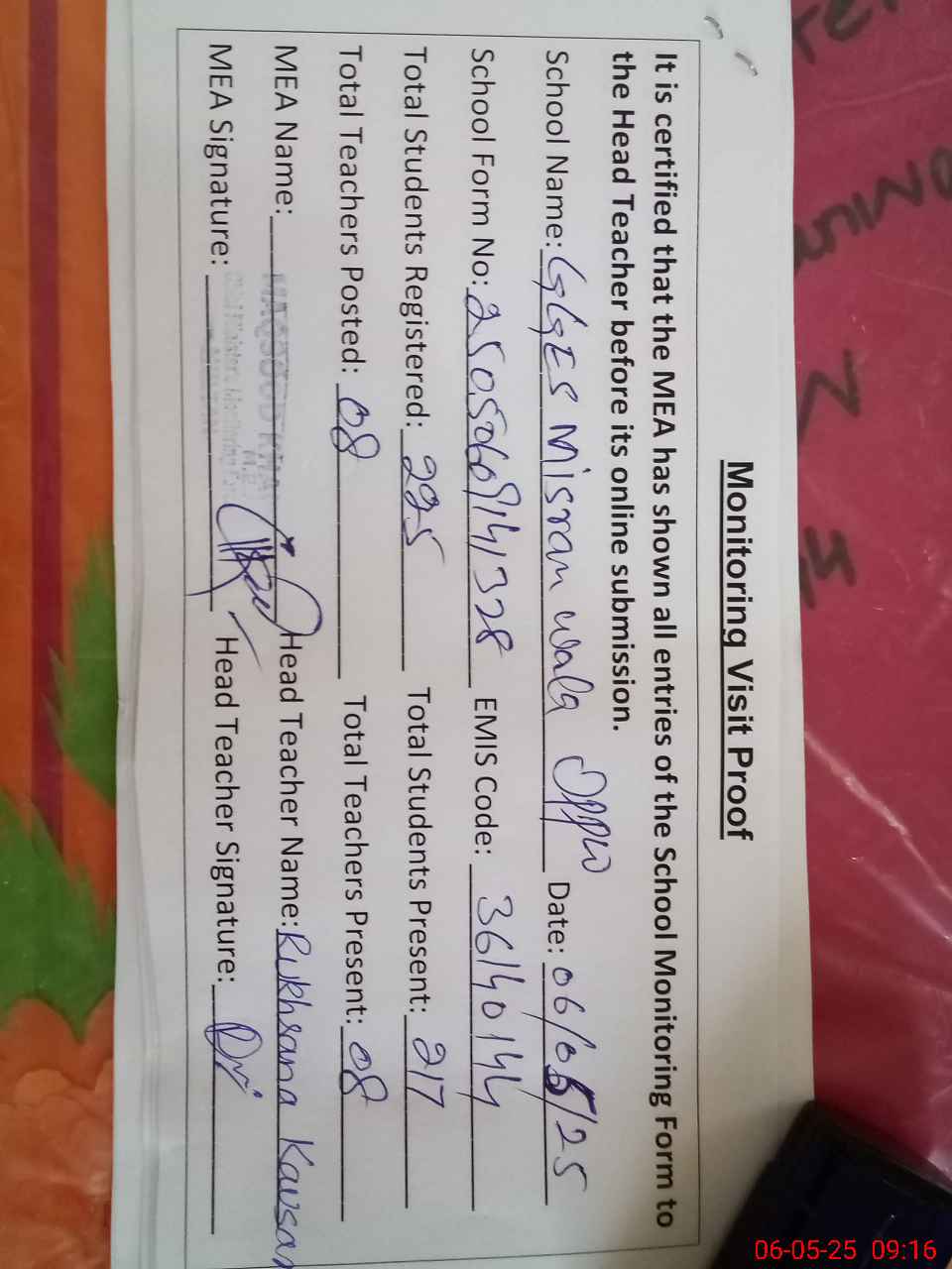 | Attendance Register | Head Teacher | MEA with School | Visit Proof |
