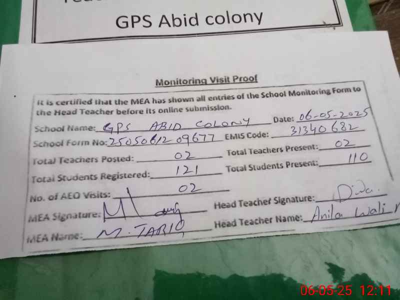 | EMIS Code: 31340682 | Name of School: GPS ABID COLONY | |||