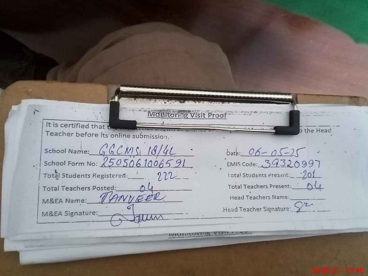 | Attendance Register | Head Teacher | MEA with School | Visit Proof |