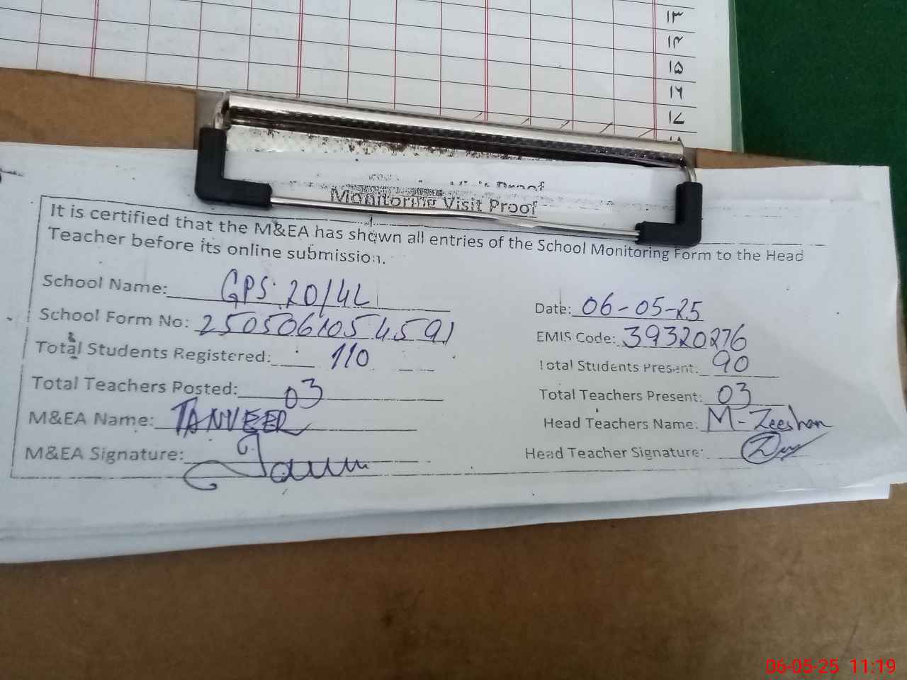| Attendance Register | Head Teacher | MEA with School | Visit Proof |