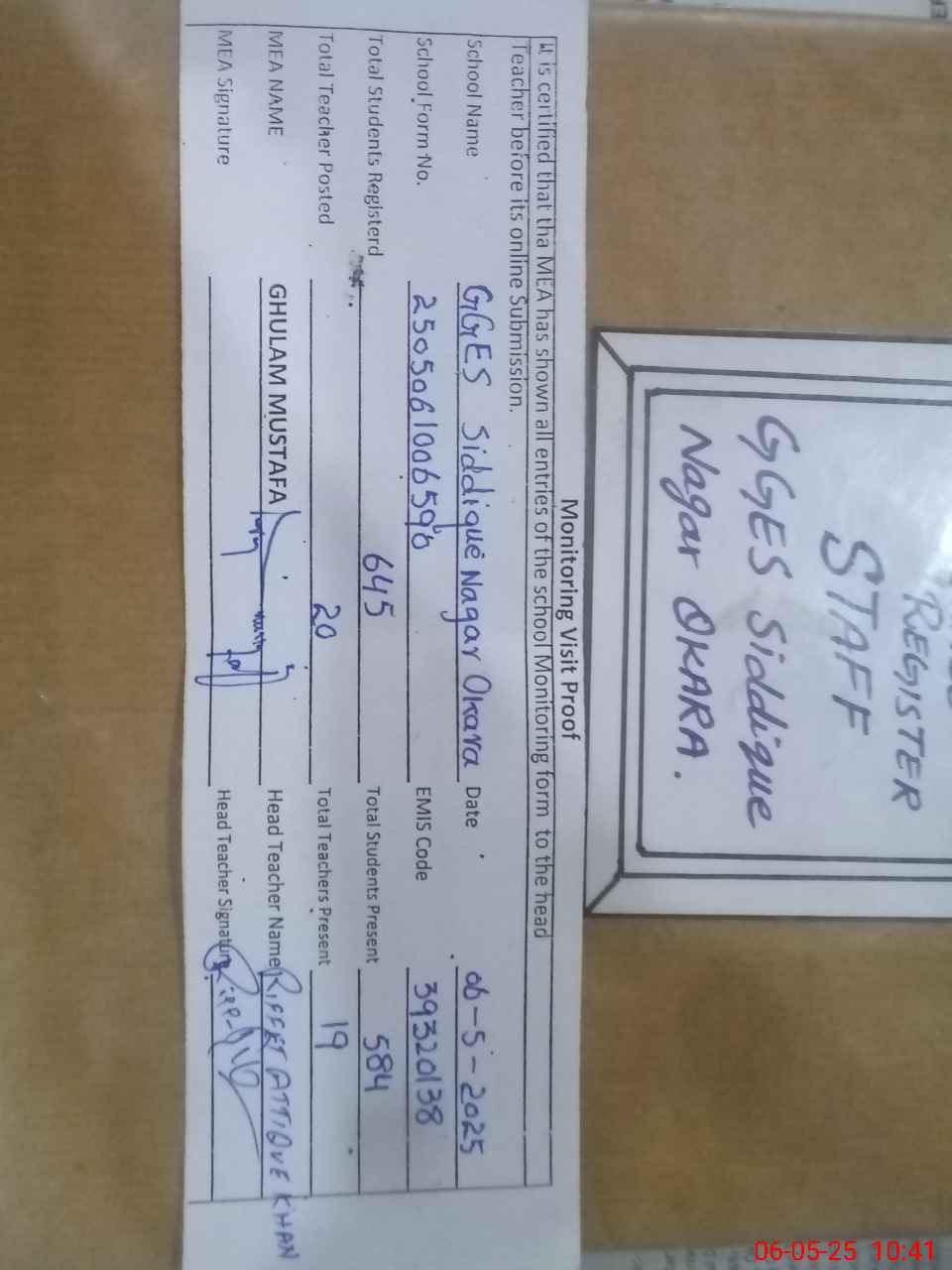 | EMIS Code: 39320138 | Name of School: GGES SIDDIQUE NAGAR OKARA | |||