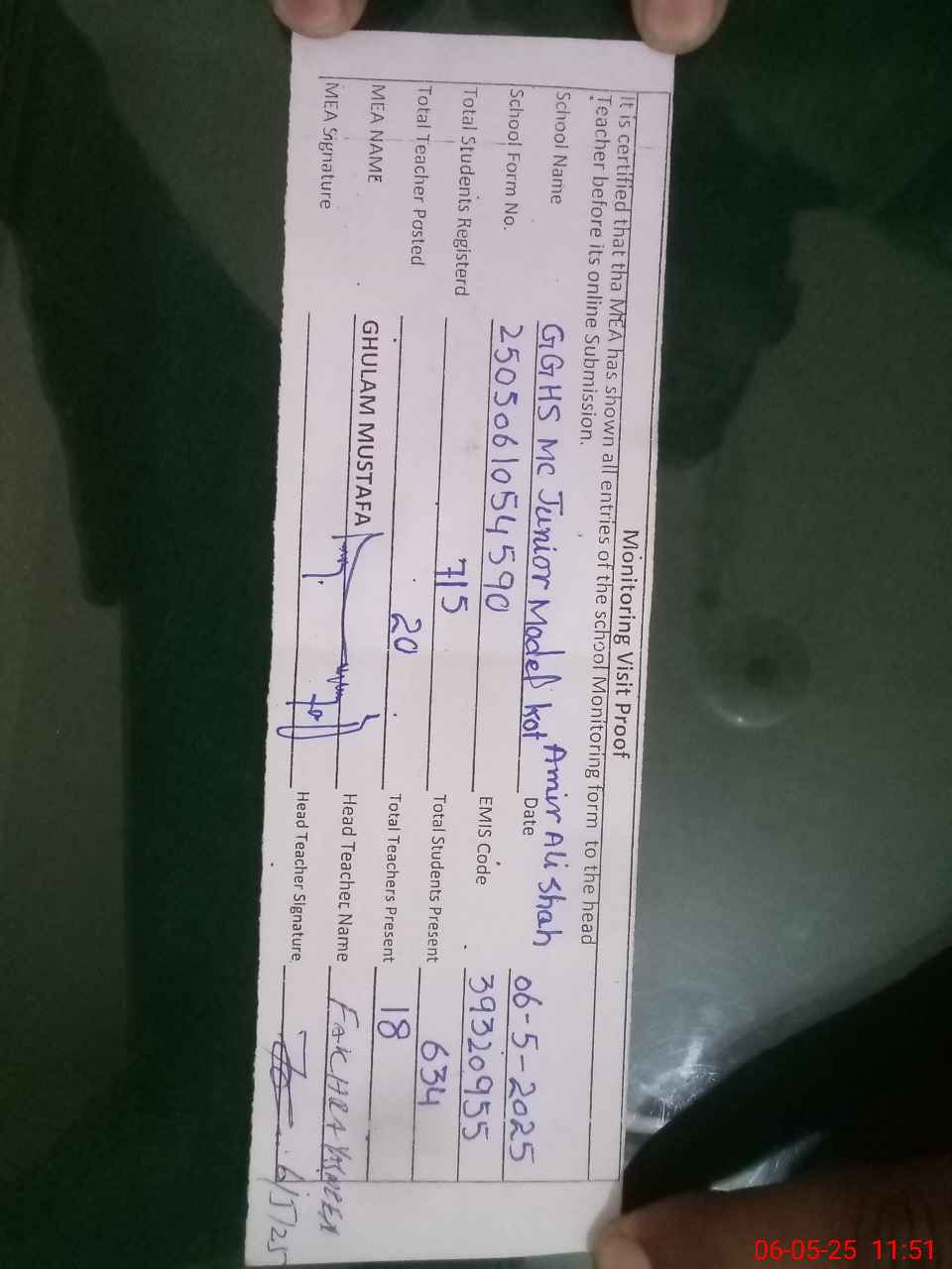| Attendance Register | Head Teacher | MEA with School | Visit Proof |