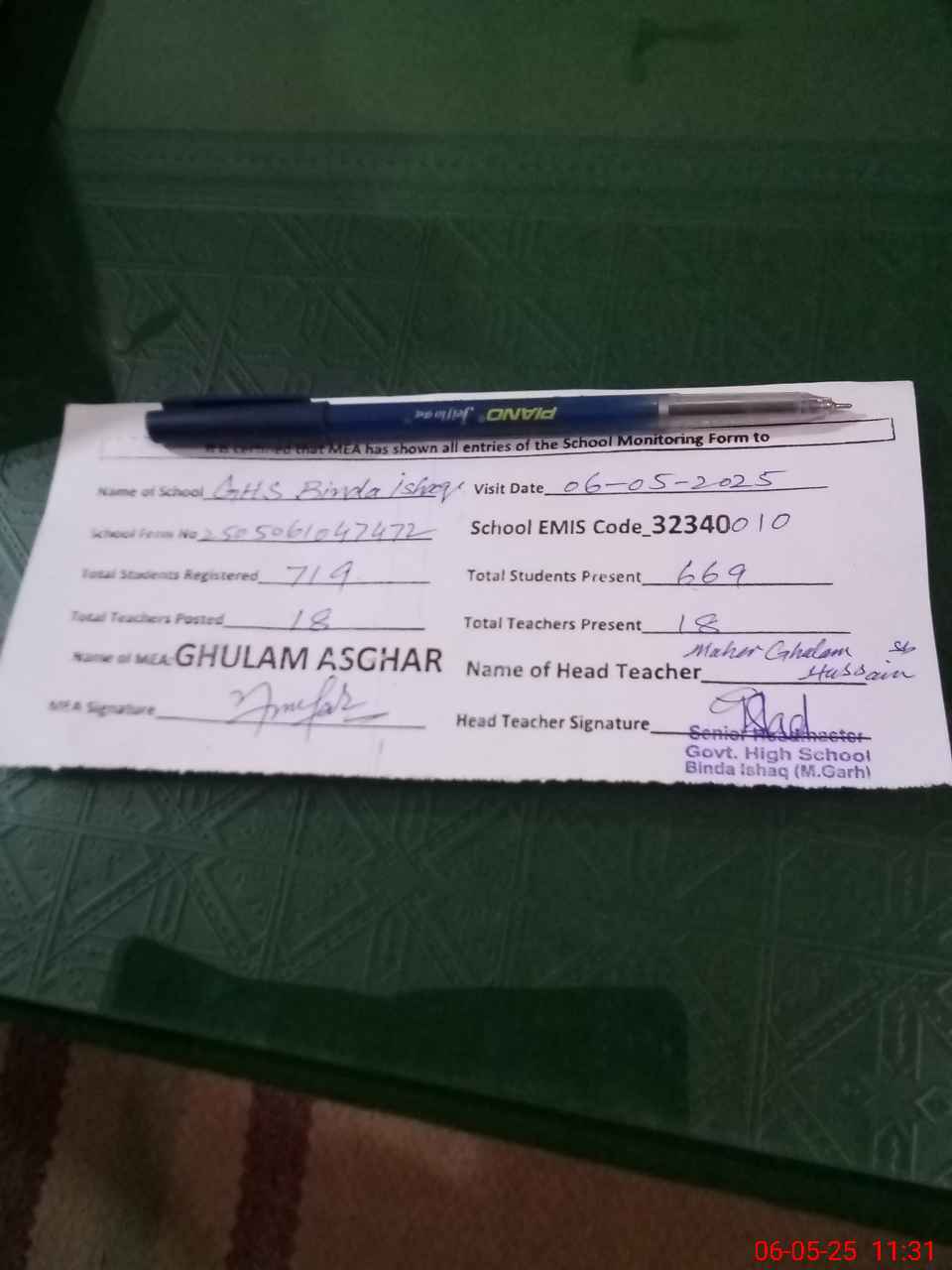 | EMIS Code: 32340010 | Name of School: GHS BINDA ISHAQ | |||