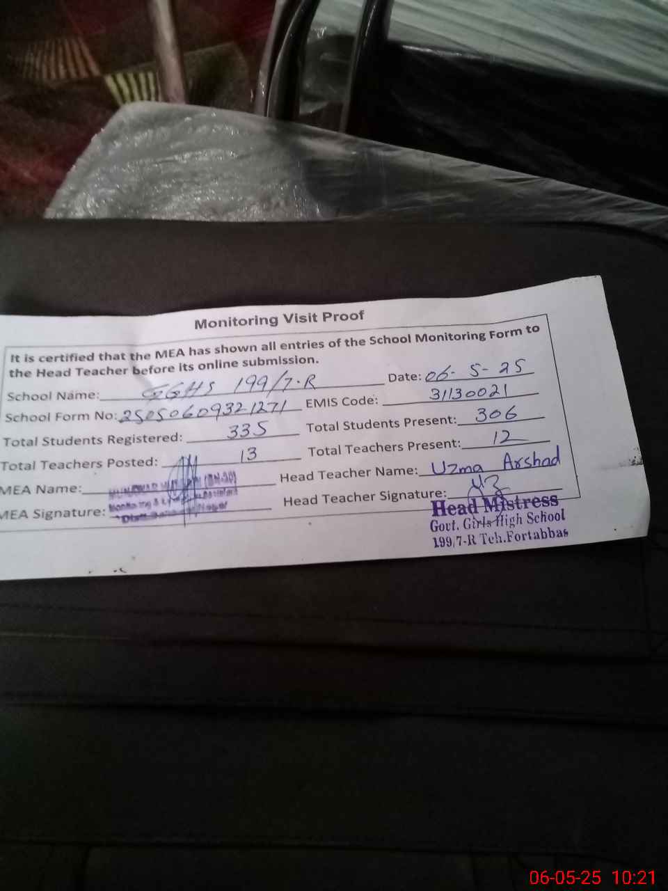 | Attendance Register | Head Teacher | MEA with School | Visit Proof |