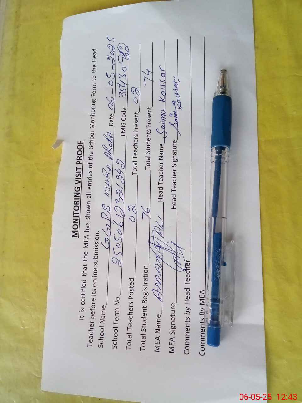 | Attendance Register | Head Teacher | MEA with School | Visit Proof |