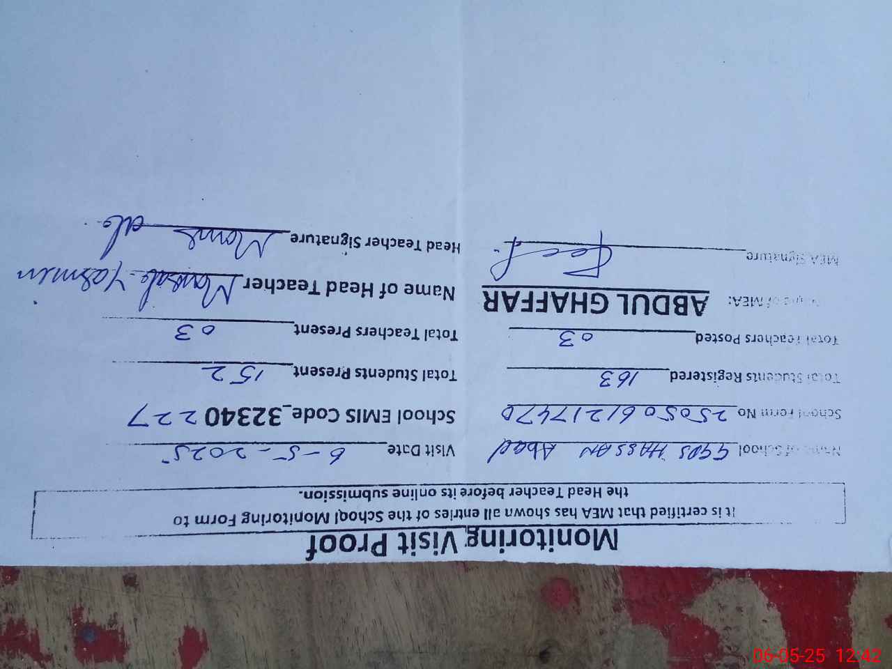 | Attendance Register | Head Teacher | MEA with School | Visit Proof |