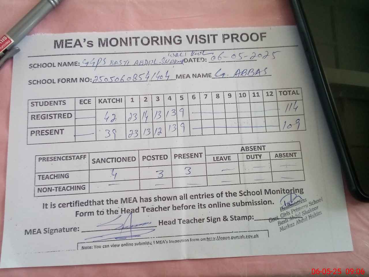 | EMIS Code: 36410469 | Name of School: GGPS BASTI ABDUL SHAKOOR WALI, ABDUL HAKIM | |||