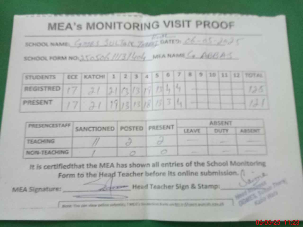 | Attendance Register | Head Teacher | MEA with School | Visit Proof |