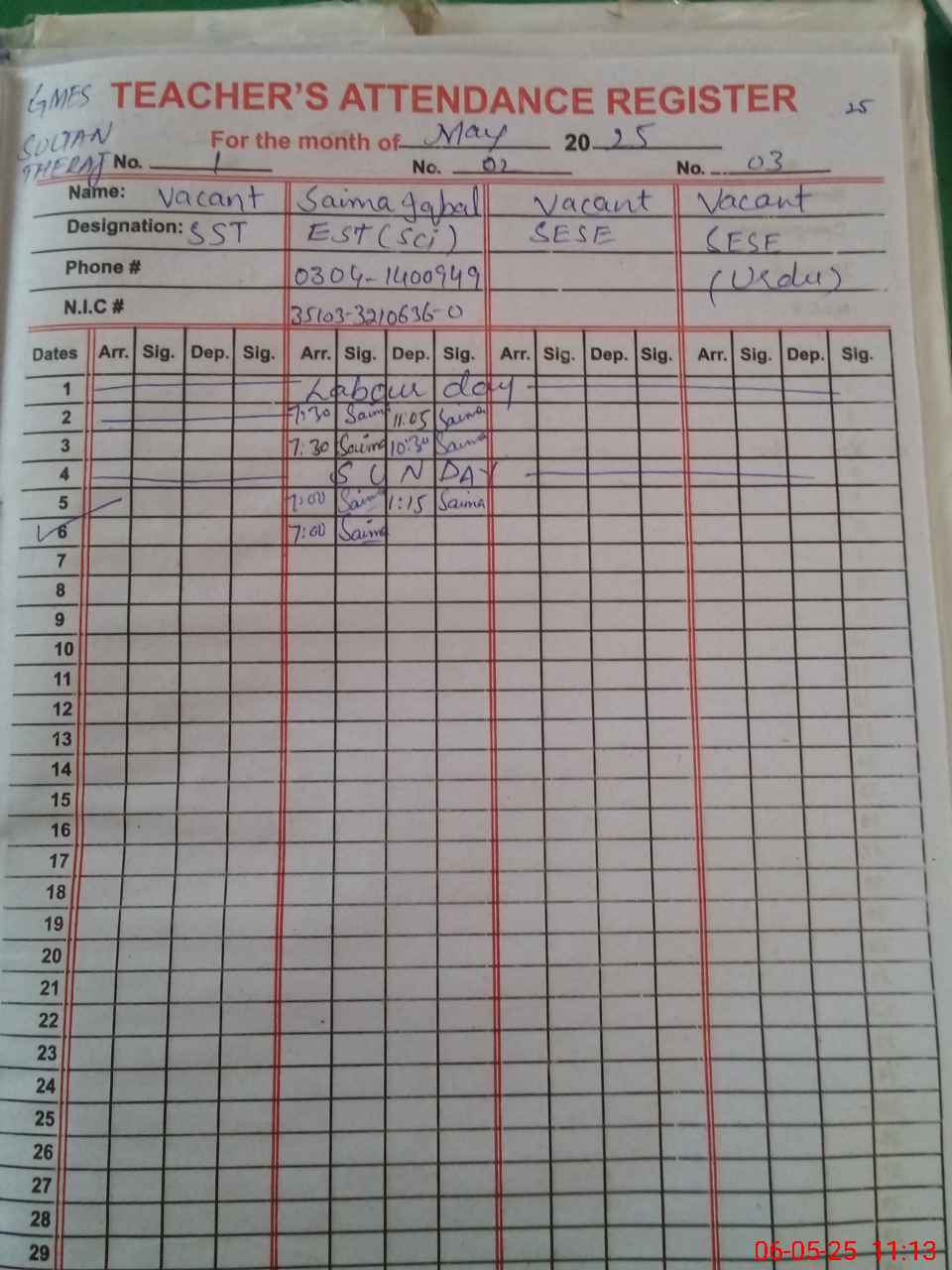 | Name: Sa**** Iq**** Designation: (School Headmaster's/Headmistress's) EST Phone/Cell Number: 03**** |