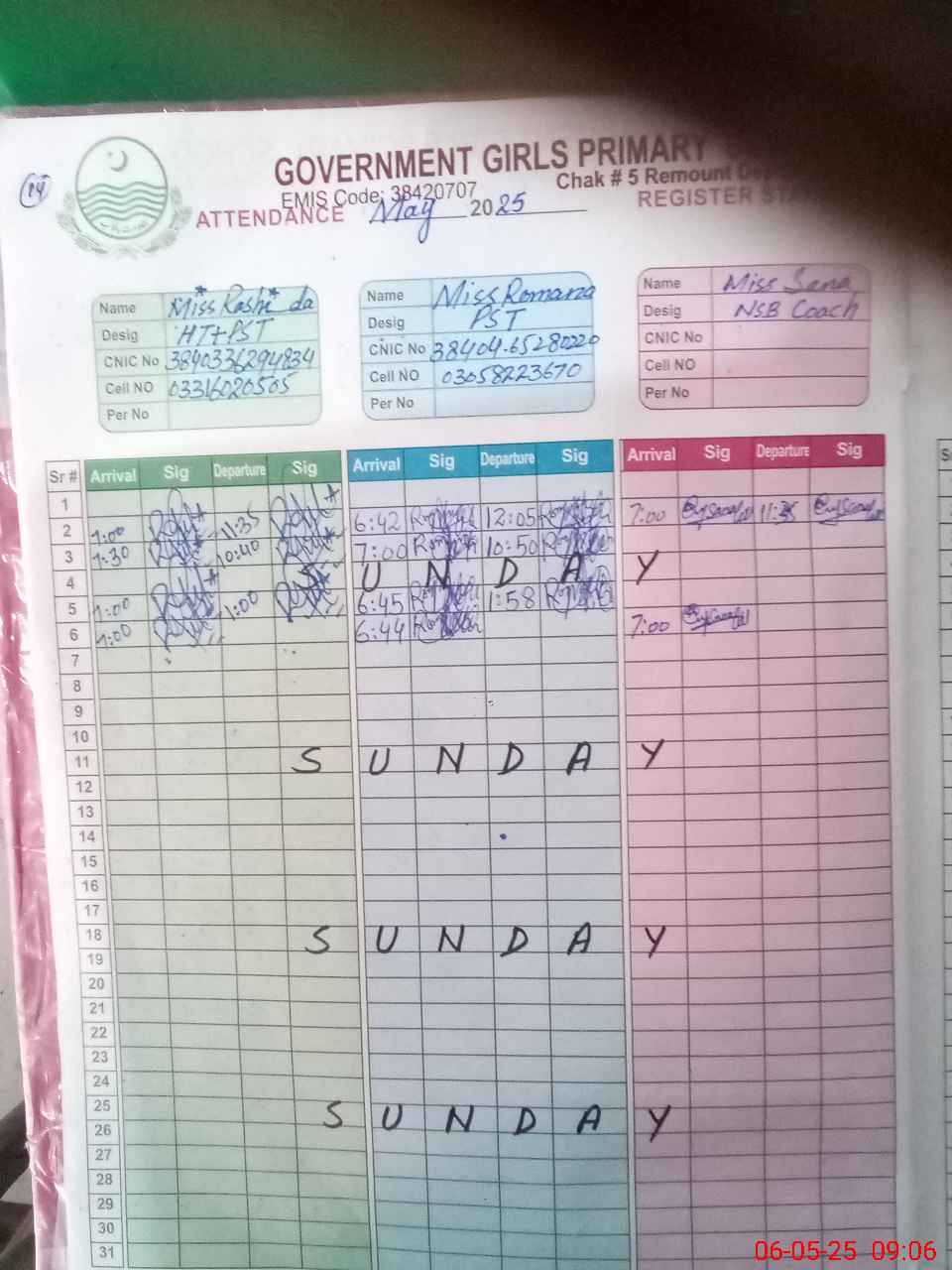 | CNIC | Full Name | Designation | R/C | Absence during last cal. month |