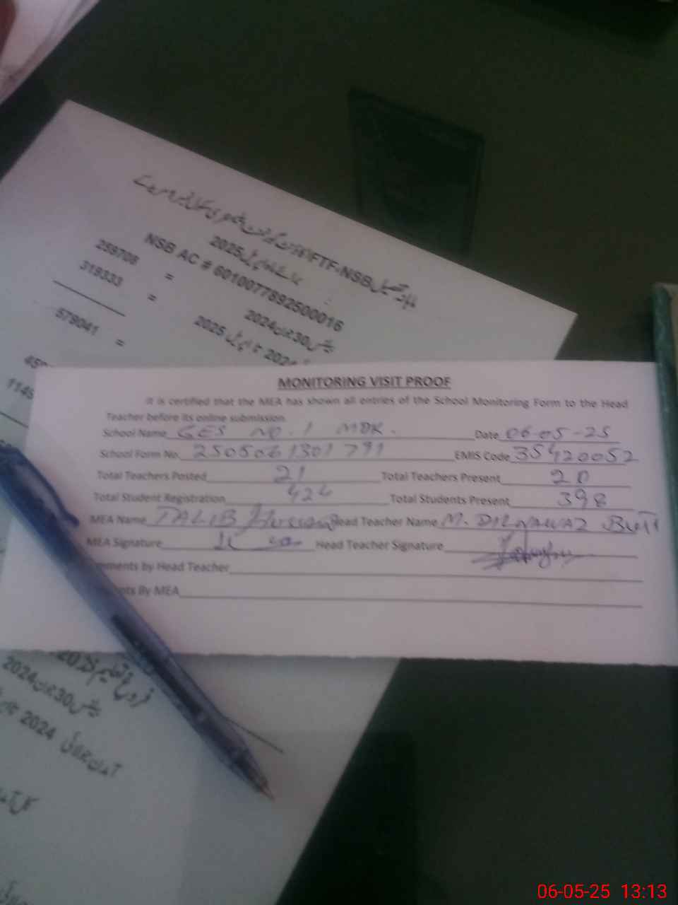 | Attendance Register | Head Teacher | MEA with School | Visit Proof |