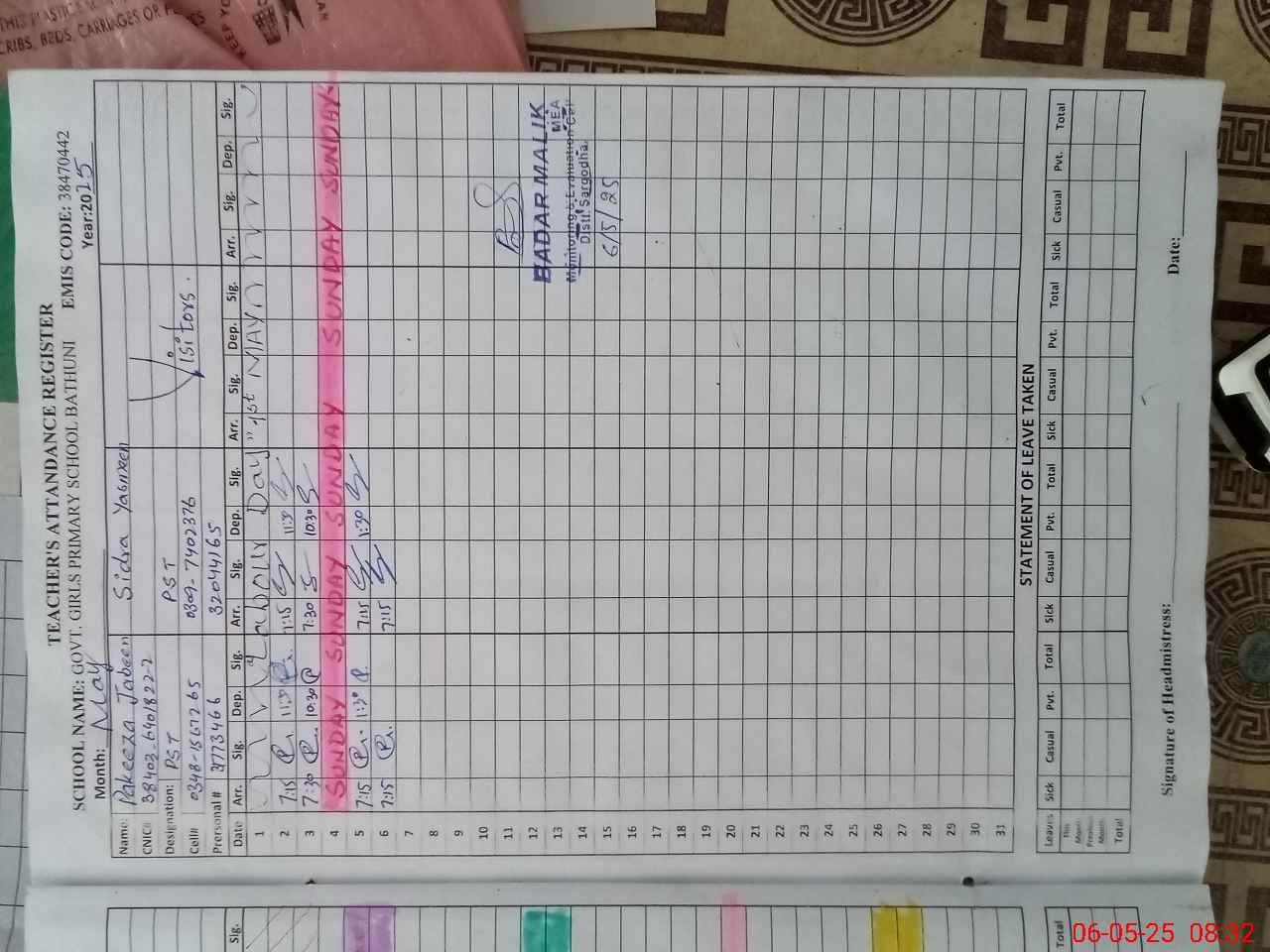 | Name: PA**** JA**** Designation: (School Headmaster's/Headmistress's) PST Phone/Cell Number: 03**** |