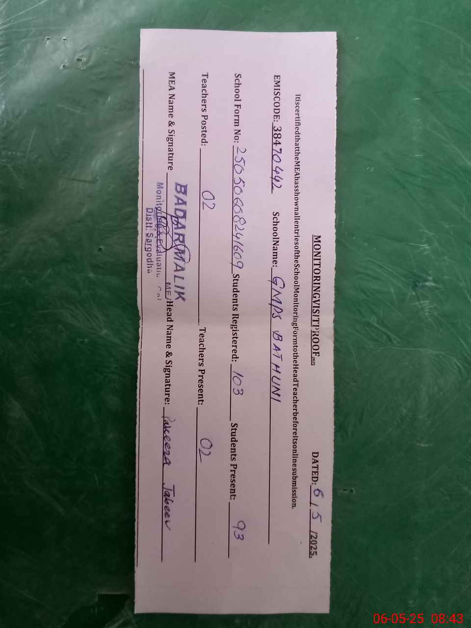 | Monitoring Date: 06-05-2025 | Start Time: 06-05-2025 08:23 AM | End Time: 06-05-2025 08:47 AM | Name of MEA: BA**** MU**** | |