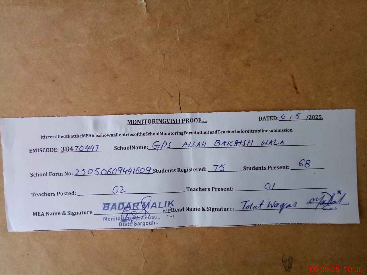 | Certified that this School was Inspected by the Undersigned MEA/DMO Today and the Information Stated Above is as Per Record. | |||||
