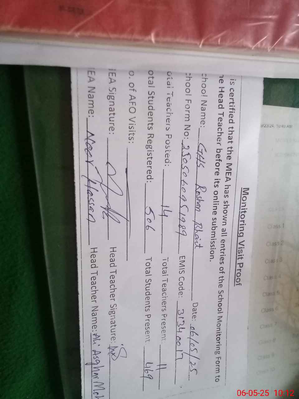 | Attendance Register | Head Teacher | MEA with School | Visit Proof |