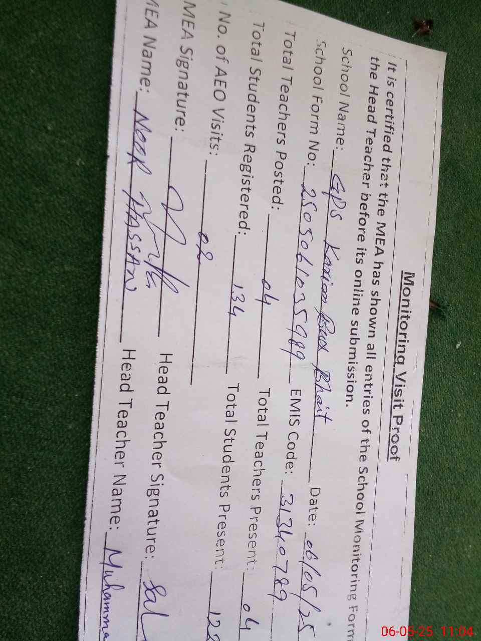 | Attendance Register | Head Teacher | MEA with School | Visit Proof |