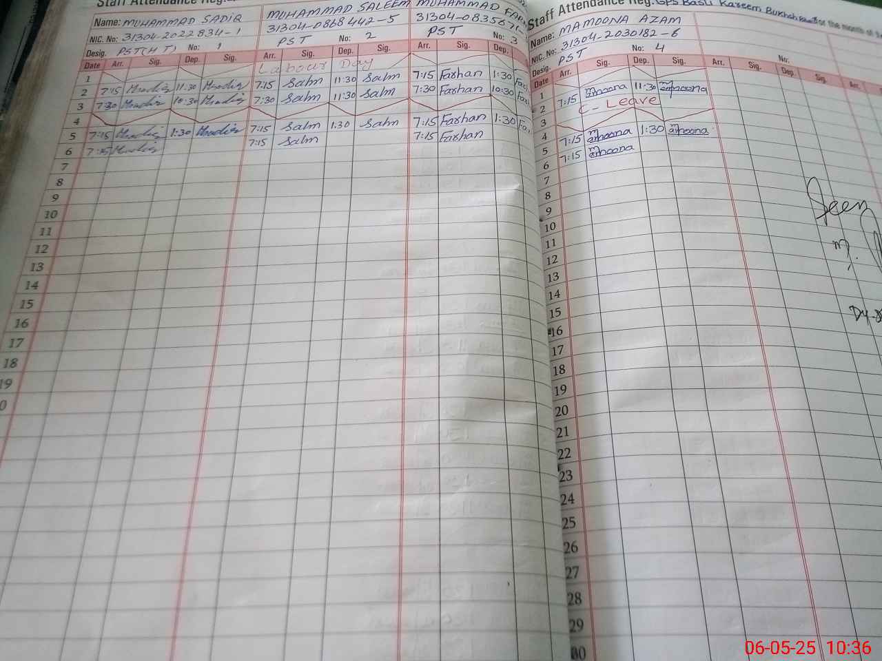 | CNIC | Full Name | Designation | R/C | Absence During Last Calender Month |