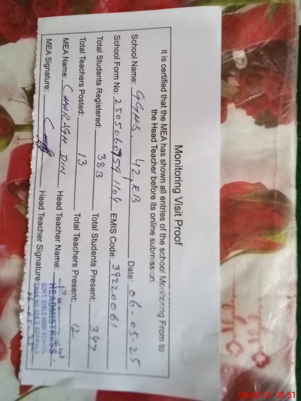 | Attendance Register | Head Teacher | MEA with School | Visit Proof |