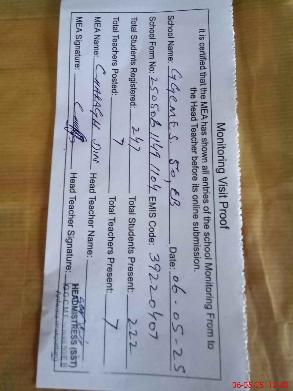 | Certified that this School was Inspected by the Undersigned MEA/DMO Today and the Information Stated Above is as Per Record. | |||||