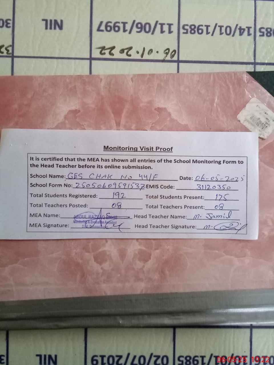 | Certified that this School was Inspected by the Undersigned MEA/DMO Today and the Information Stated Above is as Per Record. | |||||