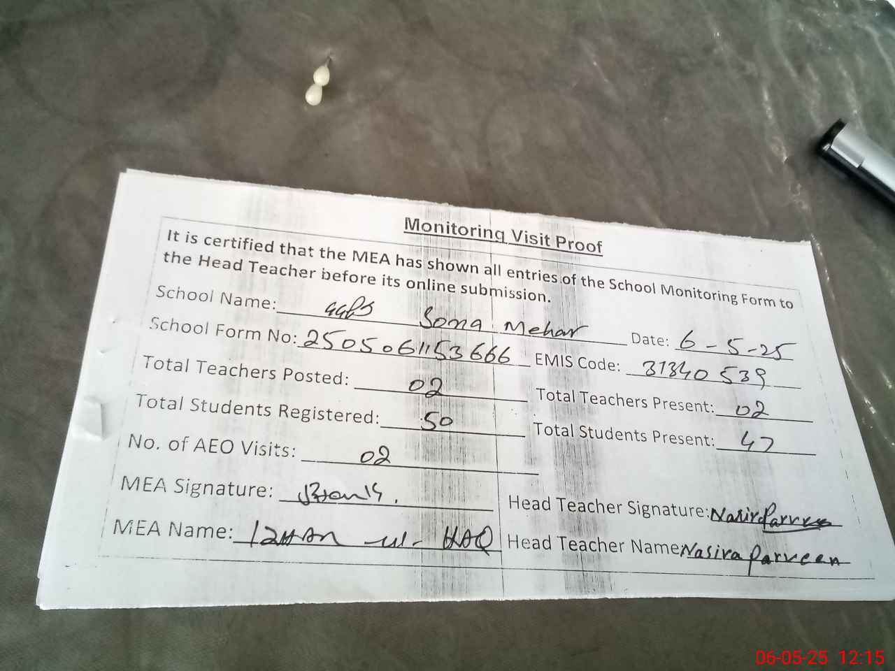 | Attendance Register | Head Teacher | MEA with School | Visit Proof |