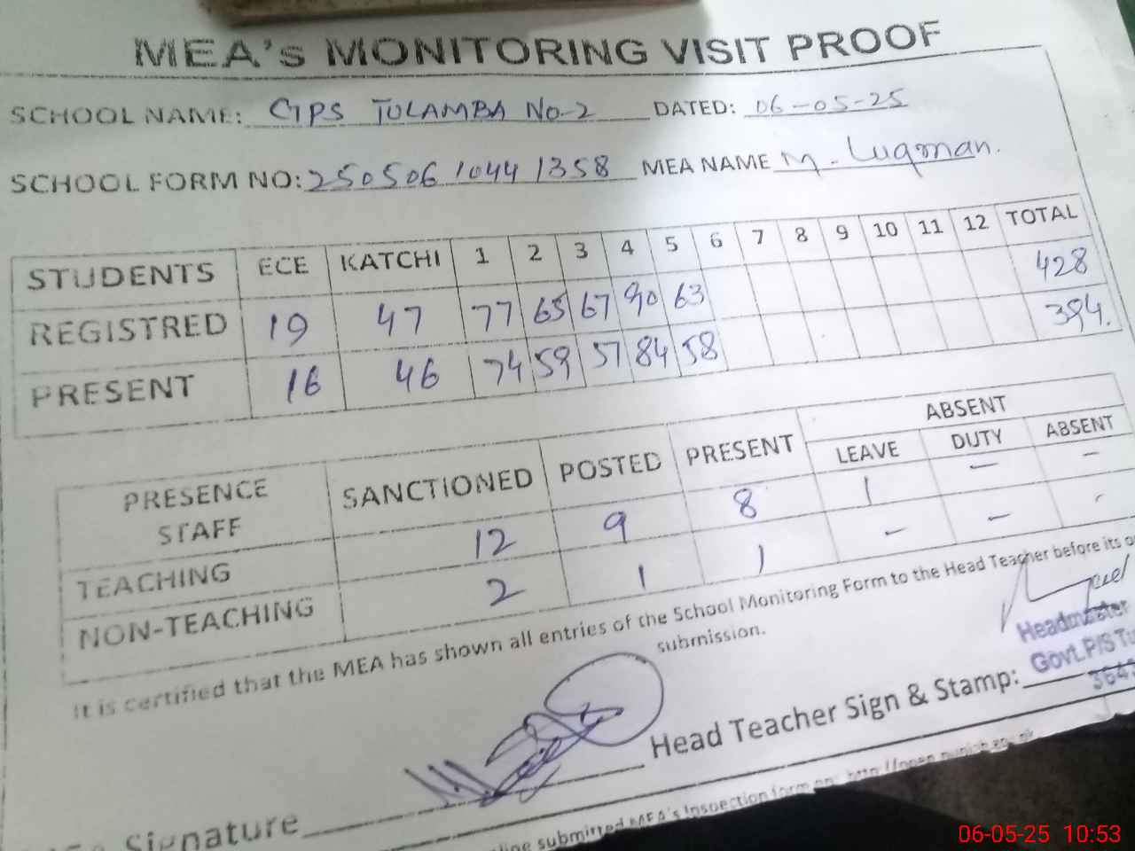 | Attendance Register | Head Teacher | MEA with School | Visit Proof |