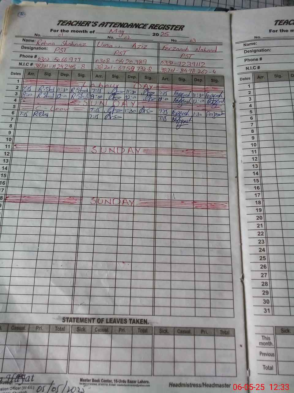 | CNIC | Full Name | Designation | R/C | Absence During Last Calender Month |