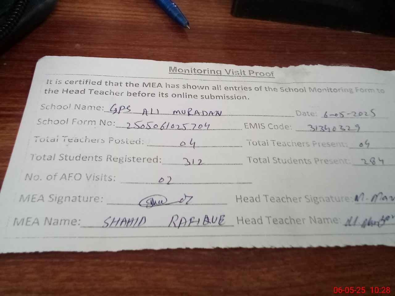| Attendance Register | Head Teacher | MEA with School | Visit Proof |
