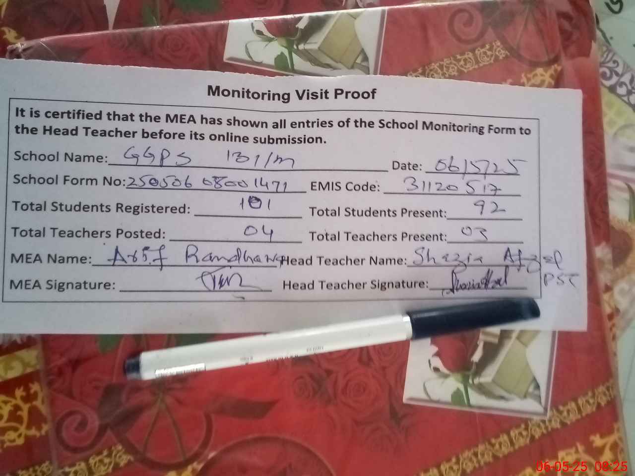 | EMIS Code: 31120517 | Name of School: GGPS CHAK NO 131 MURAD | |||