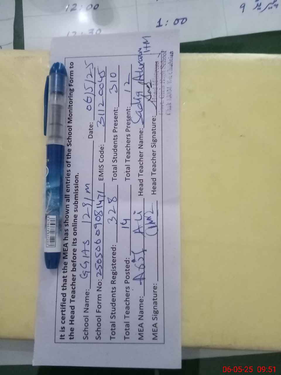 | Attendance Register | Head Teacher | MEA with School | Visit Proof |