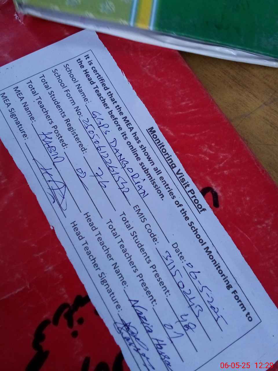 | Attendance Register | Head Teacher | MEA with School | Visit Proof |