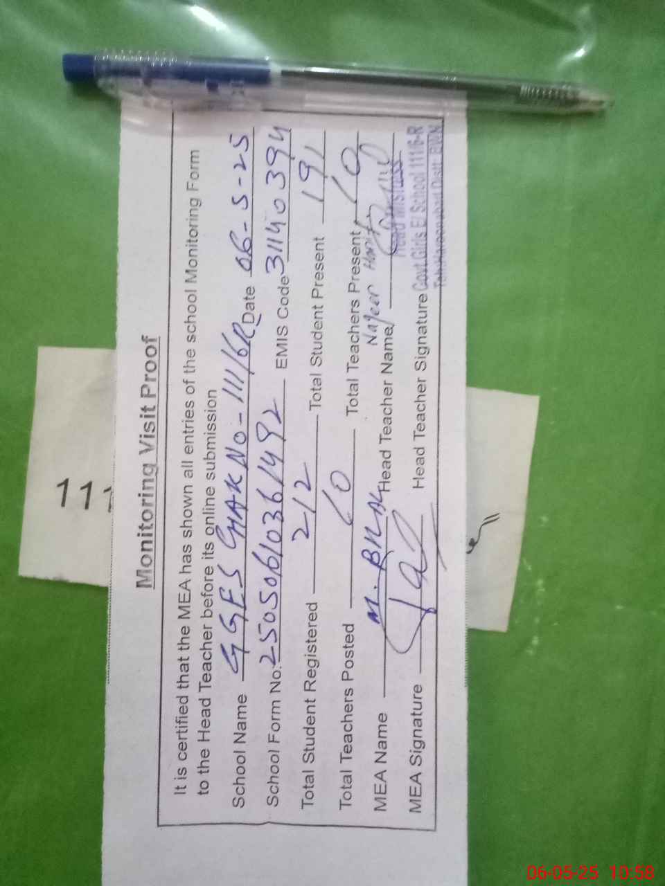 | Attendance Register | Head Teacher | MEA with School | Visit Proof |