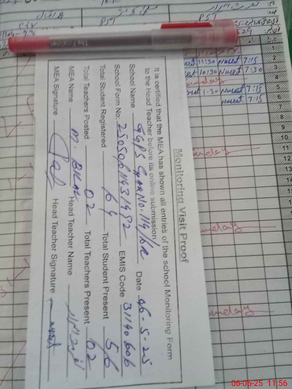 | Attendance Register | Head Teacher | MEA with School | Visit Proof |