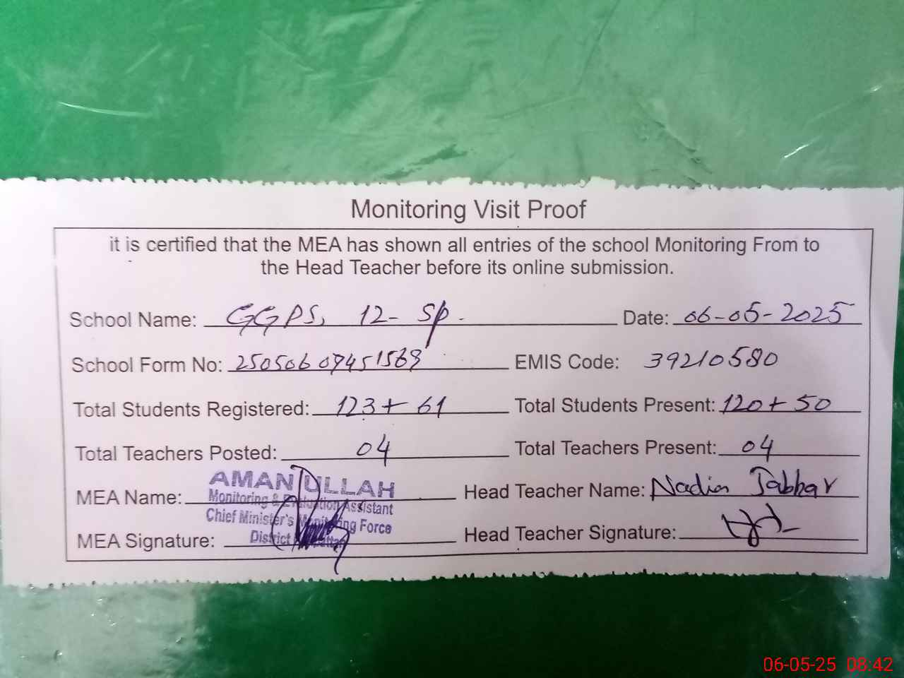 | Attendance Register | Head Teacher | MEA with School | Visit Proof |