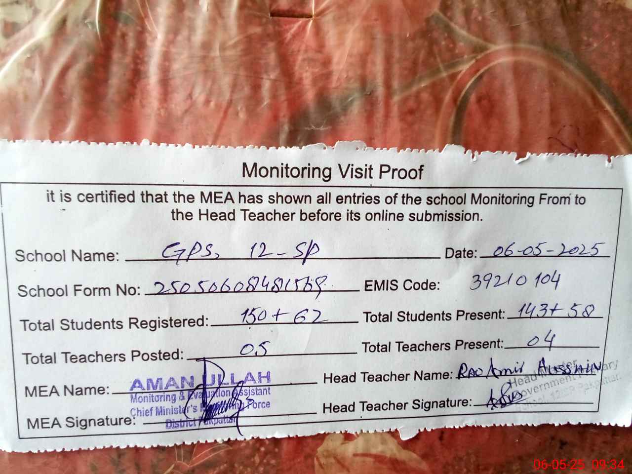 | Attendance Register | Head Teacher | MEA with School | Visit Proof |