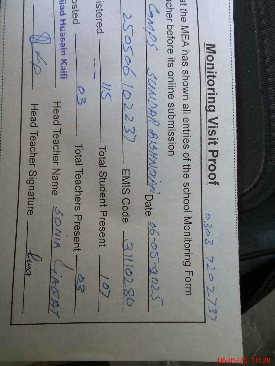 | EMIS Code: 31110280 | Name of School: GMPS SUNDAR BISHNOIAN | |||