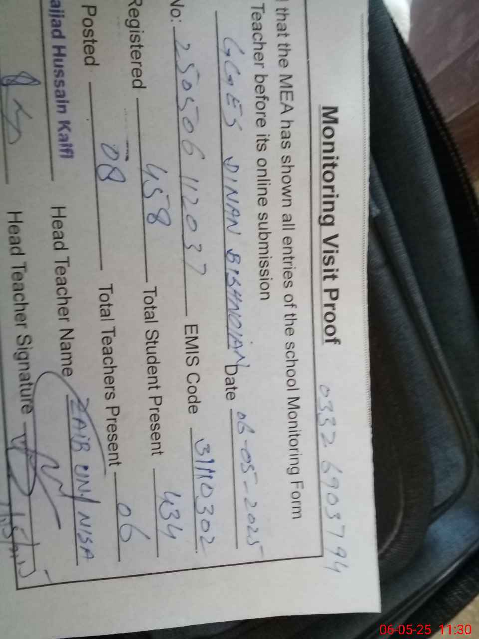 | Attendance Register | Head Teacher | MEA with School | Visit Proof |