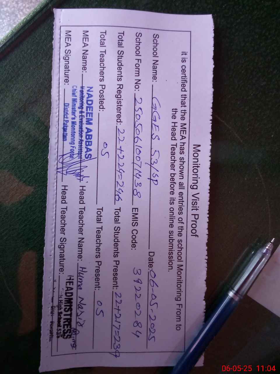 | EMIS Code: 39220284 | Name of School: GGES 53 SP POST OFFICE JEVEN SHAH | |||