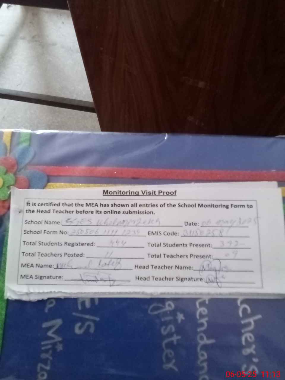 | Attendance Register | Head Teacher | MEA with School | Visit Proof |