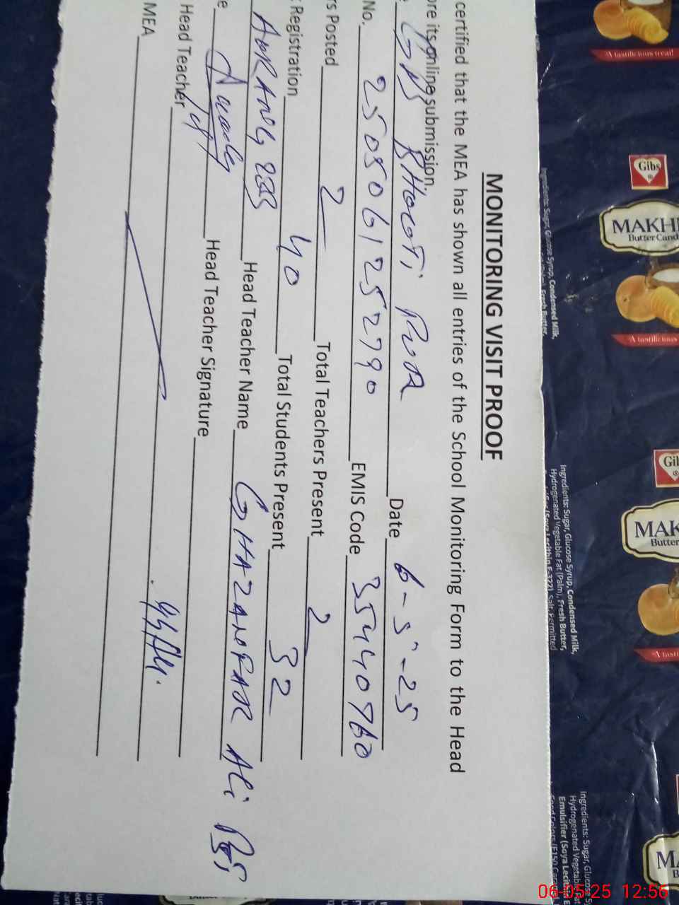 | Attendance Register | Head Teacher | MEA with School | Visit Proof |