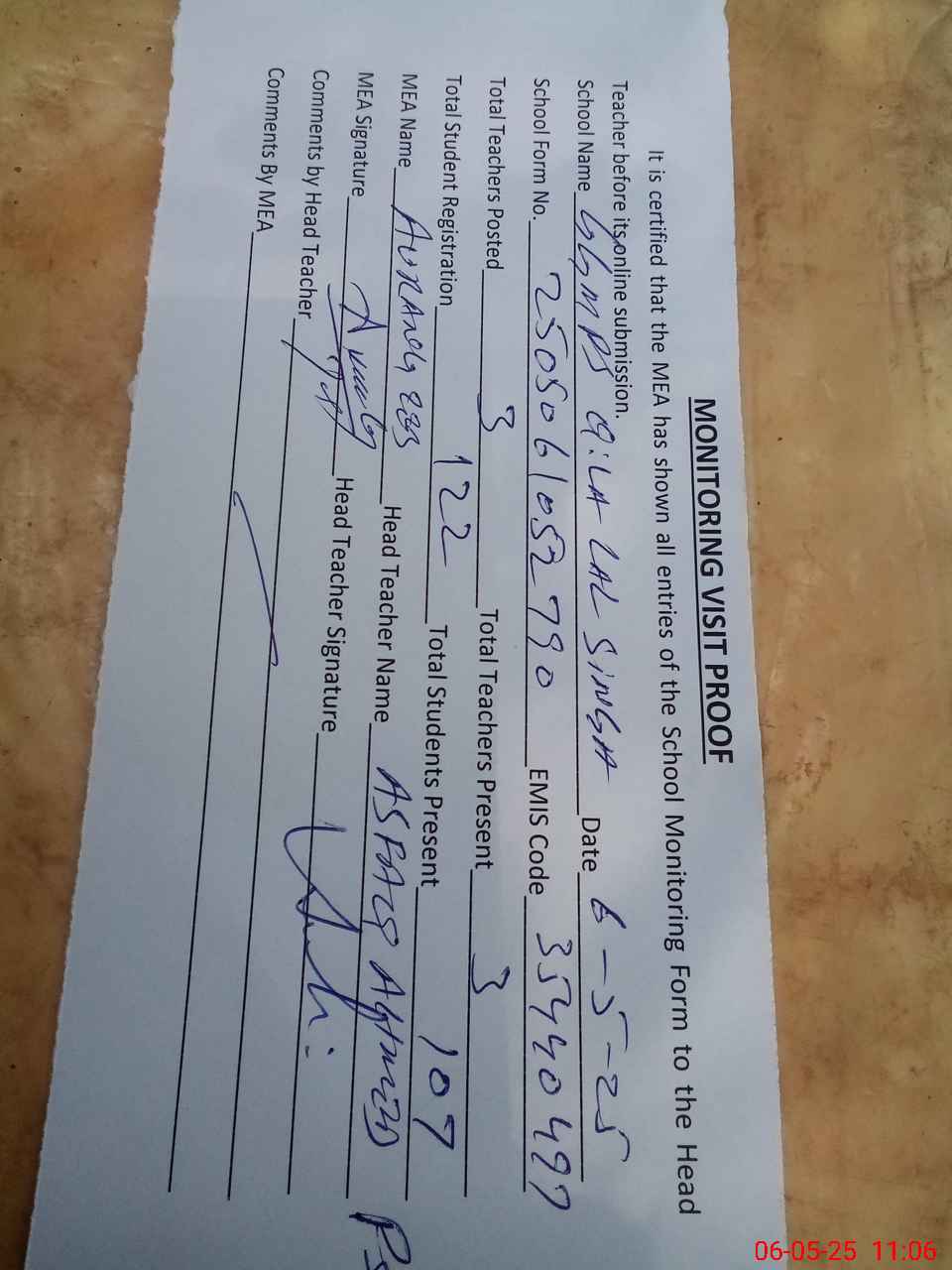 | Attendance Register | Head Teacher | MEA with School | Visit Proof |