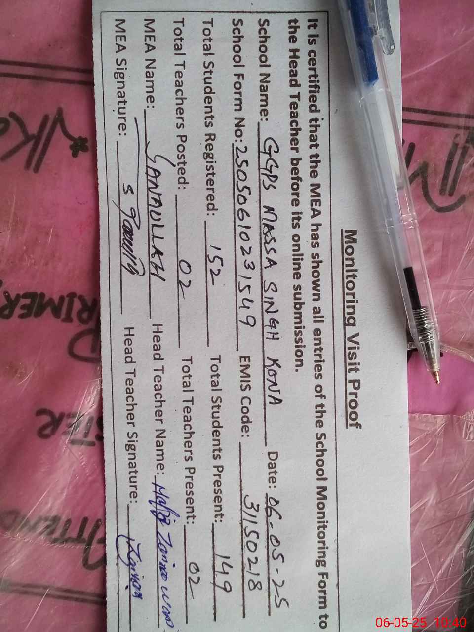 | Certified that this School was Inspected by the Undersigned MEA/DMO Today and the Information Stated Above is as Per Record. | |||||