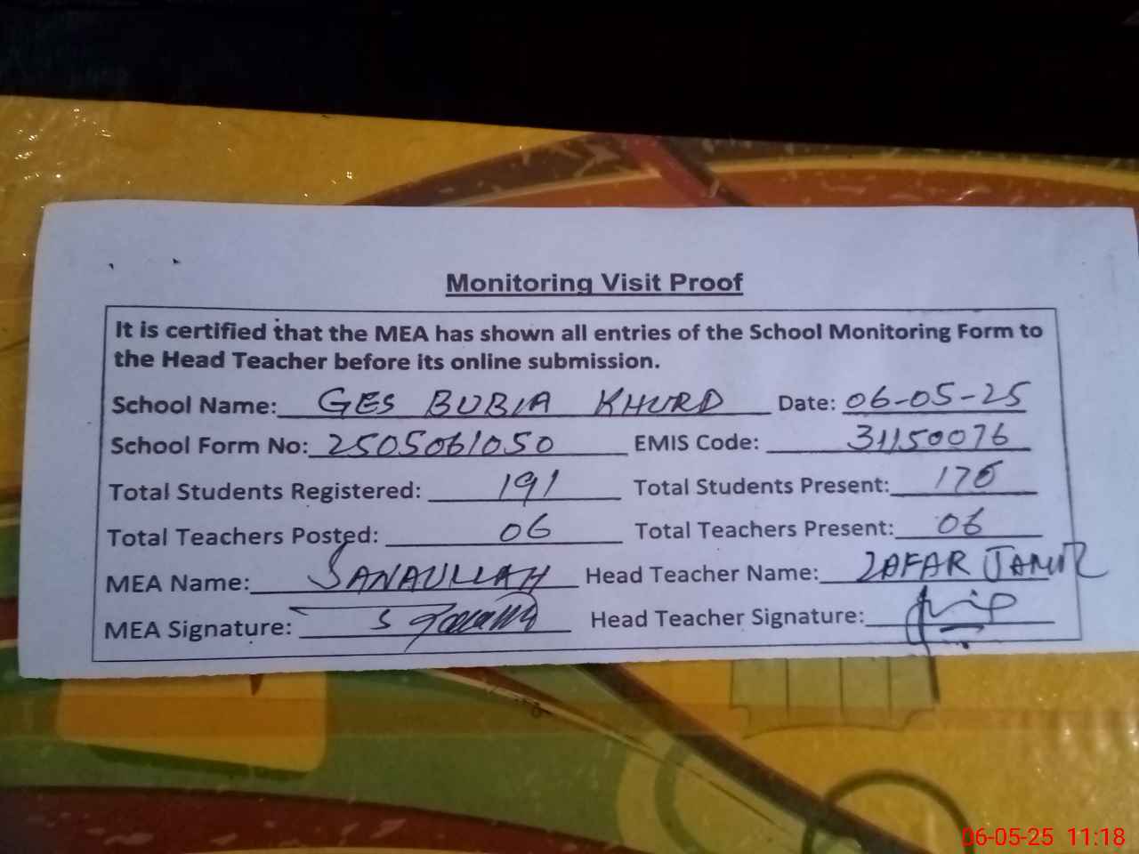 | Attendance Register | Head Teacher | MEA with School | Visit Proof |