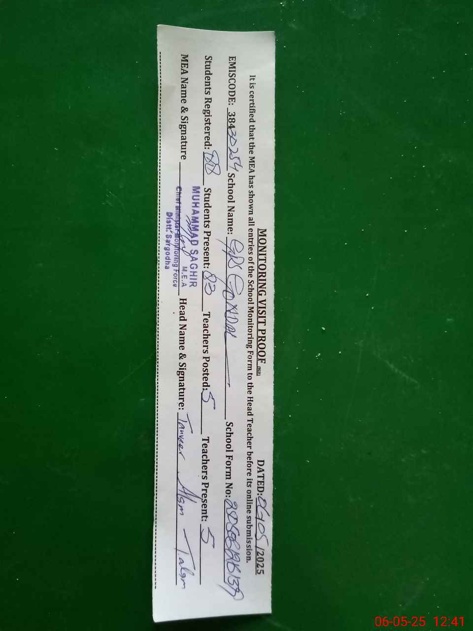 | Certified that this School was Inspected by the Undersigned MEA/DMO Today and the Information Stated Above is as Per Record. | |||||
