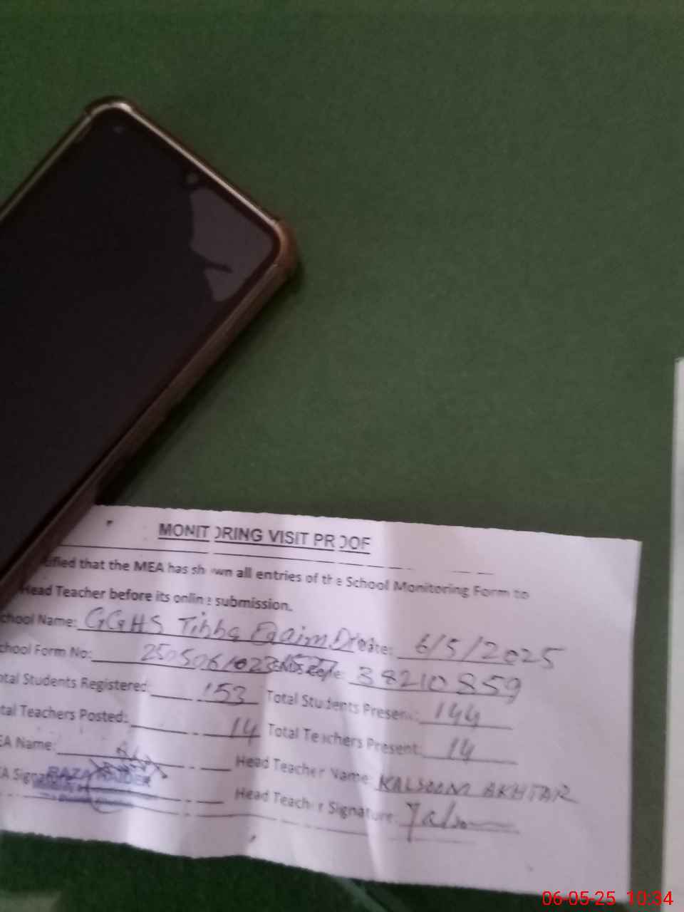 | Attendance Register | Head Teacher | MEA with School | Visit Proof |