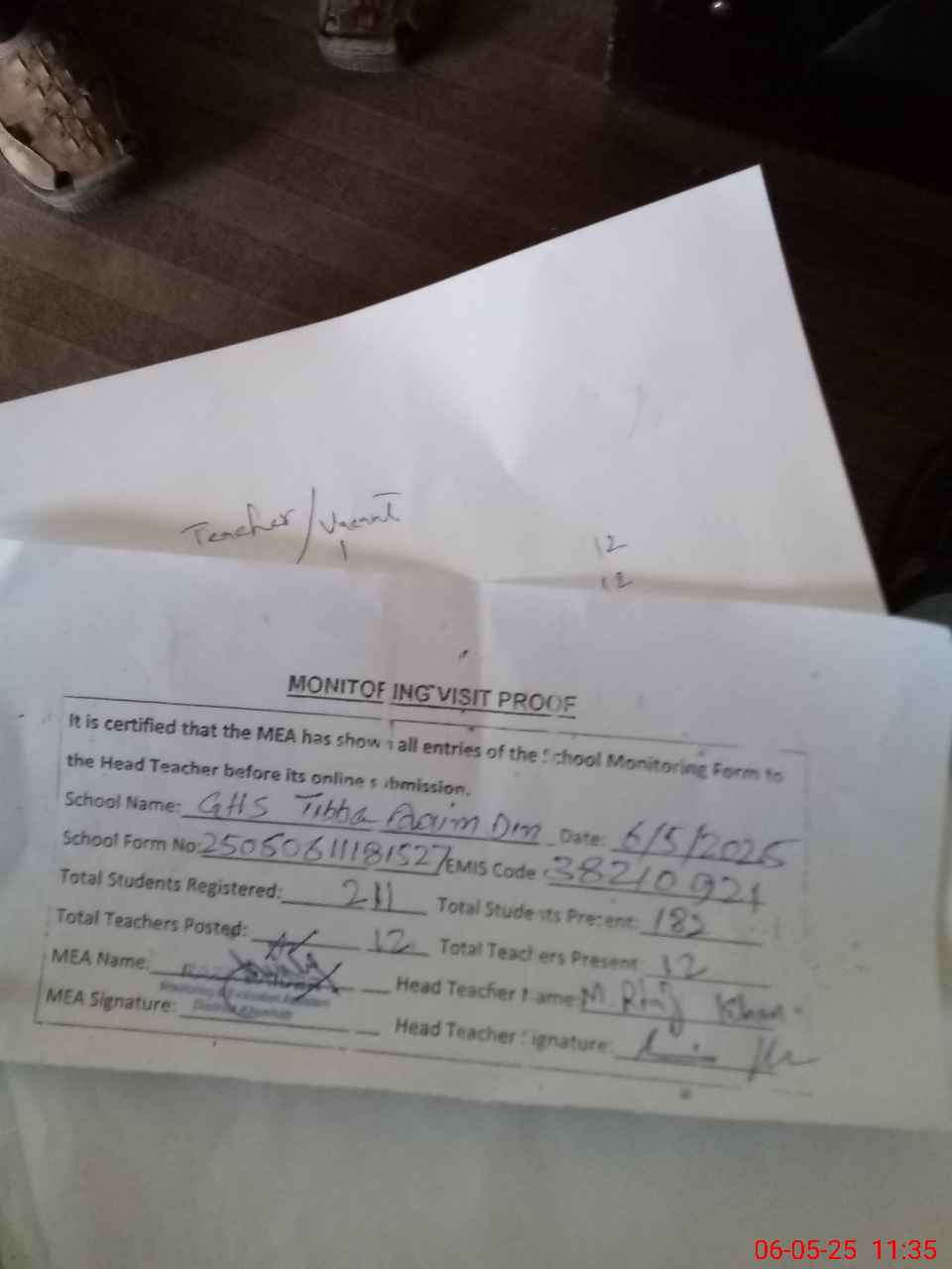 | Attendance Register | Head Teacher | MEA with School | Visit Proof |
