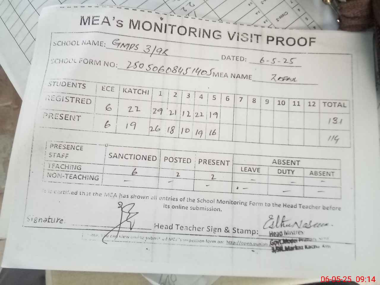 | Attendance Register | Head Teacher | MEA with School | Visit Proof |